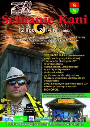 Zrzeszenie Kaszubsko - Pomorskie Oddział w Szymbarku, serdecznie zaprasza na festyn rodzinny pn. „Ścinanie Kani 2014", który odbędzie się 12 lipca (sobota) 2014 r. w Szymbarku. Akcja rozpocznie się o godz. 16:00 przemarszem Kaszubskiego Korowodu, spod remizy strażackiej na boisko sportowe w Szymbarku, z udziałem: orkiestry dętej, aktorów skeczy, zawodników biorących udział w Turnieju Sołectw, zaprzęgów konnych, oraz wszystkich zgromadzonych mieszkańców i gości.