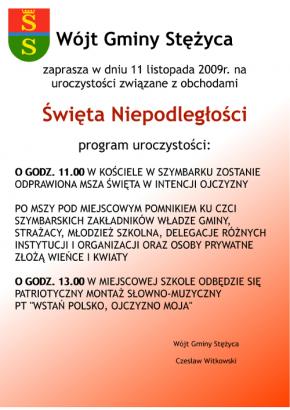 Wójt Gminy Stężyca zaprasza w dniu 11 listopada 2009r. na uroczystości związane z obchodami Święta Niepodległości