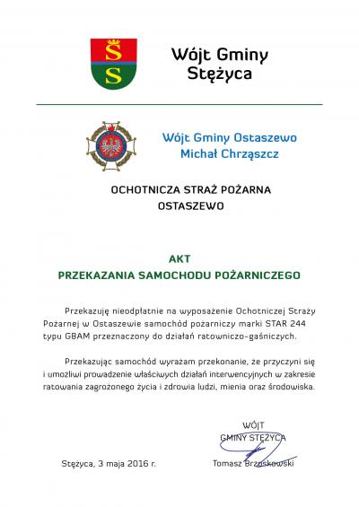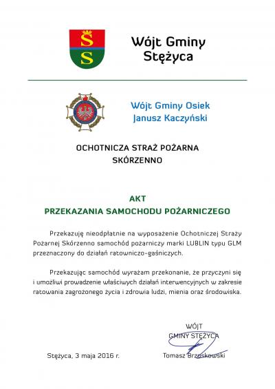 W dniu 3 maja 2016 r. podczas gminnych obchodów Dnia św. Floriana, Gmina Stężyca przekazała nieodpłatnie 3 wozy bojowe dla jednostek OSP z województwa pomorskiego i śląskiego. I tak samochód marki Lublin typu GLM trafił do Gminy Osiek, a użytkowany będzie w jednostce OSP Skórzenno. Samochód marki Star 244 typu GBAM przekazany został do Gminy Ostaszewo, a kolejny samochód tej samej marki pojechał do śląskiej Gminy Gorzyce, a jednostki OSP Turza Śląska.