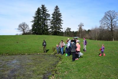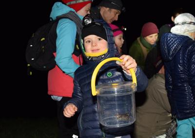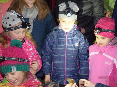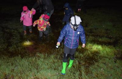 Po zapadnięciu zmroku, wyposażeni w kalosze i latarki czołówki młodzi przyrodnicy ruszyli na poszukiwanie płazów. Udało nam się znaleźć ropuchę szarą, żabę trawną i jej skrzek, żabę jeziorkową, żabę moczarową. Nie zabrakło też traszki grzebieniastej i zwyczajnej. Ogromnym zaskoczeniem była różnorodność barw ropuchy szarej (różne odcienie szarości) – przy porównywaniu dwóch osobników można było to zauważyć.