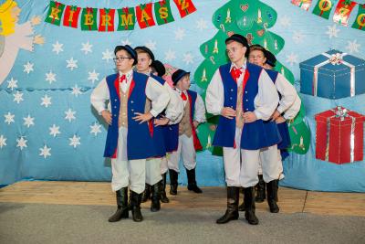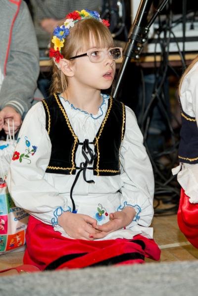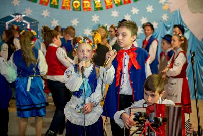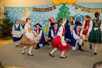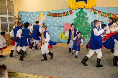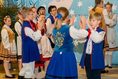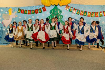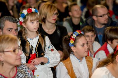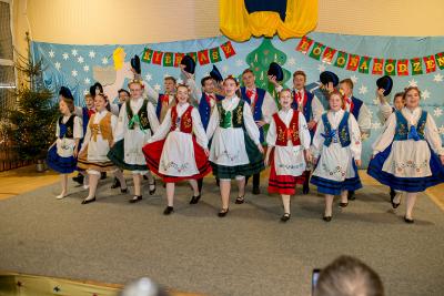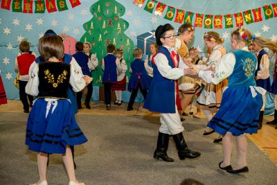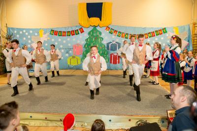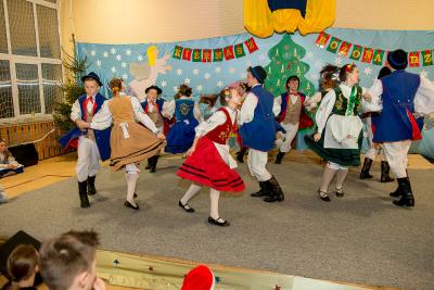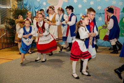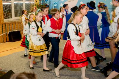 Nie tylko śpiew uświetnił ten wyjątkowy dzień. Wyrazy podziwu należą się bowiem naszemu szkolnemu Kaszubskiemu Zespołowi Pieśni i Tańca Marzebionczi, który od wielu lat prowadzi z pasją i zaangażowaniem p. Alicja Zdrojewska. Pierwszy występ przed publicznością mają za sobą dzieci z najmłodszej grupy, które taniec kaszubski ćwiczą od niedawna. Pojawiła się również na scenie starsza grupa uczniów, która kolejny raz nie zawiodła widowni, przedstawiając wielki kunszt i talent.