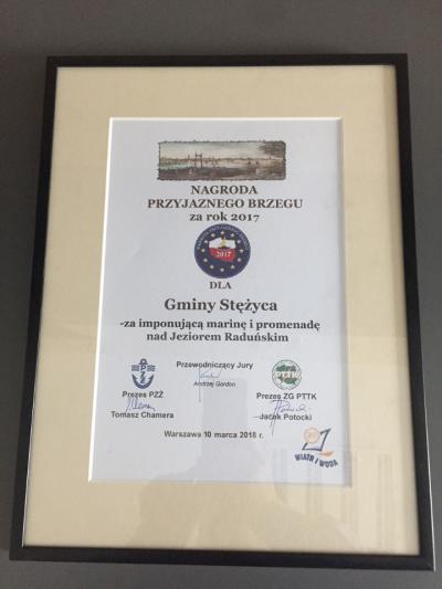 W dniu 10 marca 2018 roku podczas XXX Targów Sportów Wodnych „Wiatr i Woda”, które odbyły się w Warszawie, Gmina Stężyca została uhonorowana nagrodą Przyjazny Brzeg w kategorii Porty i Przystanie. Konkurs ten organizowany jest przez Centrum Turystyki Wodnej Polskiego Towarzystwa Turystyczno-Krajoznawczego pod patronatem honorowym Ministra Sportu i Turystyki, Ministra Gospodarki Morskiej i Żeglugi Śródlądowej, Prezesa Polskiej Organizacji Turystycznej oraz Państwowego Gospodarstwa Wodnego Wody Polskie. Skład komisji konkursowej przyznał nagrodę dla Gminy Stężyca za budowę imponującej mariny i promenady nad Jeziorem Raduńskim Górnym. Motywując swą decyzję, Przewodniczący Jury mówił: ”Mariny, przystanie i obiekty turystyczne powstające w ostatnich latach zmieniają obraz turystyki. Ich standard, funkcjonalność i wkomponowanie w otoczenie mogłoby śmiało konkurować z podobnymi obiektami za granicą, często już je przewyższając. To staraniem władz lokalnych powiększa się ofertę dla turystyki. To włodarze miast i gmin odmieniają oblicze swych regionów, ku pożytkowi społeczności lokalnej i turystów”. Po nagrodzie Marszałka Województwa Pomorskiego za „Najlepszą Przestrzeń Publiczną 2015”, wyróżnienie to jest już kolejna nagrodą dla tej inwestycji.