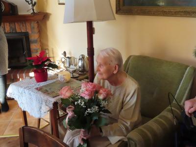 Oprócz gorących życzeń Jubilatka otrzymała bukiet kwiatów wraz z upominkiem.