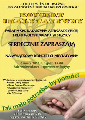 6 marca 2011 roku, o godz. 19.00 w hali widowiskowo-sportowej w Stężycy odbędzie się Koncert Charytatywny pod hasłem „To co w życiu ważne to zauważyć drugiego człowieka". Organizatorami koncertu są parafia św. Katarzyny Aleksandryjskiej w Stężycy oraz Klub Wolontariatu. Podczas spotkania muzycznego zbierane będą środki na potrzeby chorej dziewczynki i rodzin zaniedbanych przez środowisko.