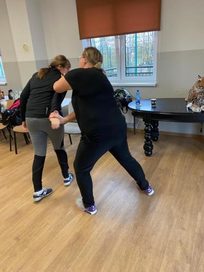 Pracownicy Gminnego Ośrodka Pomocy Społecznej w Stężycy w swojej pracy w terenie niejednokrotnie spotykają się z sytuacjami niebezpiecznymi, osobami pod wpływem alkoholu lub innych środków odurzających oraz agresywnymi. Obecnie pracownik socjalny może zwrócić się do Policji o asystę podczas wywiadu, jednakże nie zawsze pracownik jest w stanie przewidzieć, że w danym miejscu taka pomoc będzie potrzebna. Jako, że w swojej pracy powinni czuć się bezpiecznie, to 26 października br. uczestniczyli w organizowanych przez pracodawcę szkoleniach podnoszących poziom bezpieczeństwa osobistego podczas wykonywania czynności zawodowych. Zajęcia praktyczne i teoretyczne miały na celu pokazanie i przećwiczenie paru elementów samoobrony niezbędnych w sytuacji ataku bądź gróźb kierowanych do pracownika socjalnego. Podczas szkolenia przedstawiano też podstawy wiedzy psychologicznej, pozwalającej uspokoić nietrzeźwego czy agresywnego napastnika.