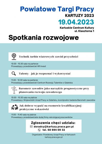 Powiatowy Urząd Pracy w Kartuzach organizuje POWIATOWE TARGI PRACY – KARTUZY 2023, które odbędą się 19.04.2023 r. w godz. 10.00-13.00 w Kartuskim Centrum Kultury w Kartuzach, ul. Klasztorna 1.
