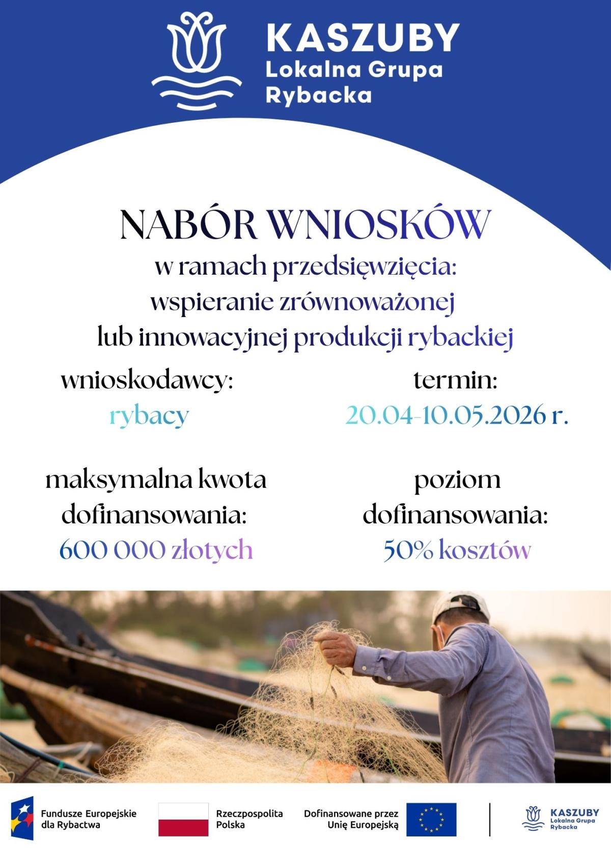 Lokalna Grupa Rybacka Kaszuby ogłasza nabory wniosków o dofinansowanie dla Rybaków w ramach Lokalnej Strategii Rozwoju na lata 2021-2027