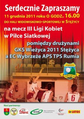 Serdecznie zapraszamy 11 grudnia 2011 roku o godz. 16.00 do Hali Widowiskowo-Sportowej w Stężycy na mecz III Ligi Kobiet w Piłce Siatkowej pomiędzy drużynami GKS Wieżyca 2011 Stężyca a EC Wybrzeże APS TPS Rumia.