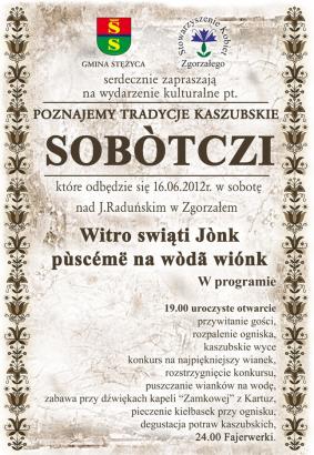 Serdecznie zapraszamy na wydarzenie kulturalne pt. Poznajemy Tradycje Kaszubkie SOBÒTCZI, które odbędzie się 16.06.2012 r. w sobotę nad J.Raduńskim w Zgorzałem.