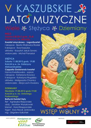 To już V edycja Kaszubskiego Lata Muzycznego. Tegoroczne koncerty odbędą się w Stężycy, Wielu i Dziemianach. Zapraszamy do Stężycy dnia 11 sierpnia 2012 r. godz. 19.00. W naszym parafialnym kościele wystąpi Cappella Gedanensis kwartet.