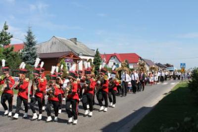 Po mszy dziękczynnej za tegoroczne zbiory, korowód pod przewodnictwem Gminnej Orkiestry Dętej z wieńcami dożynkowymi przeszedł na plac przy hali sportowej, gdzie przygotowano bogaty program artystyczny tej uroczystości.