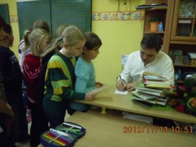 Na spotkaniu z młodymi czytelnikami autor barwnie i dowcipnie opowiadał o swojej twórczości, która charakteryzuje się niezwykłym zrozumieniem psychiki dziecka i ciepłym humorem.