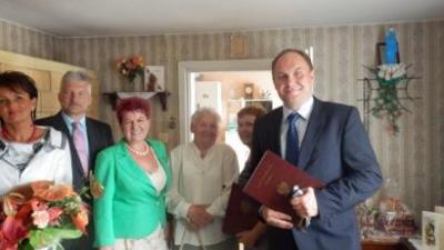 Jubilatowi serdeczne gratulacje i gorące życzenia zdrowia, szczęścia, pomyślności, miłości, szacunku rodziny i przyjaciół w tym wspaniałym dniu złożyli przedstawiciele Urzędu Gminy Stężyca: Wójt Gminy Tomasz Brzoskowski, Przewodniczący Rady Gminy Stefan Literski, Sabina Kobiela z Urzędu Stanu Cywilnego oraz Sekretarz Gminy Ewa Borzestowska.