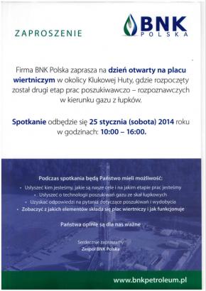 Informujemy, że w dniu 25 stycznia 2014 r. (sobota) od godz. 10 do godz. 16 odbędzie się dzień otwarty na placu wiertniczym w okolicy Klukowej Huty, gdzie rozpoczął się drugi etap prac poszukiwawczo - rozpoznawczych w kierunku gazu z łupków. W załączeniu plakat.